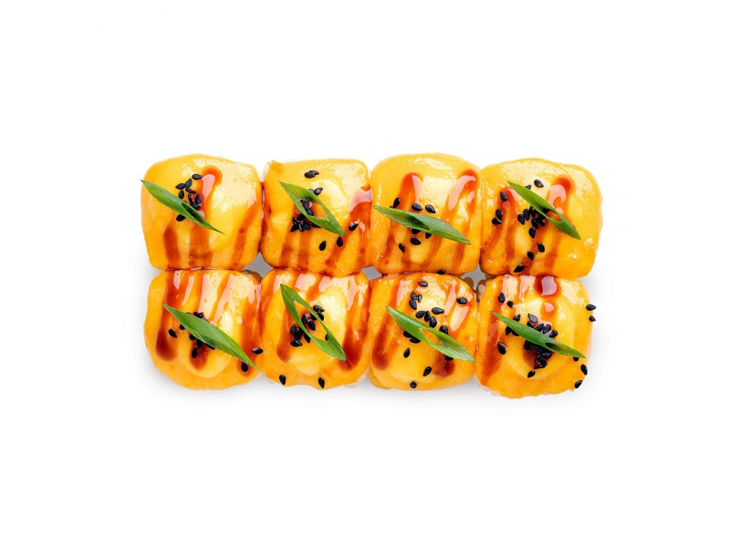 рис лосось-гриль сыр чеддер авокадо икра тобико соус чесночный соус унаги кунжут зеленый лук нори